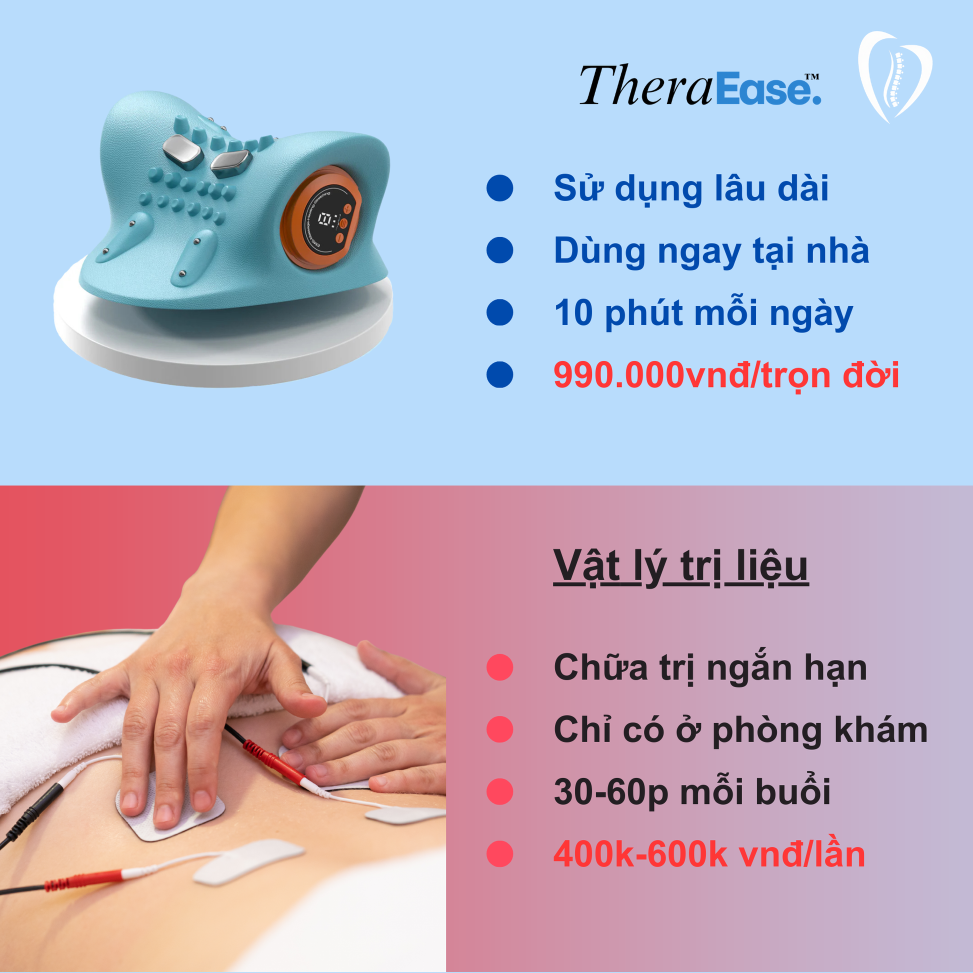 Máy trị liệu TheraEase kết hợp kéo giãn, nhiệt trị liệu và massage giúp giải phóng áp lực lên cột sống cổ, giảm căng cơ và giải phóng dây thần kinh bị chèn ép. Nhờ đó, cảm giác đau mỏi được cải thiện nhanh và cổ vai gáy trở nên nhẹ hơn, linh hoạt hơn.